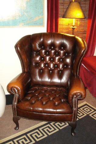 The auction began with “box lots”, which were boxes of random small items. These boxes ranged from a collection of terracotta pots to stereo equipment to kitchen utensils and were selling for anywhere from $5 to $50. After the box lots, an endless parade of auctions items began making their way to the floor and people were winning all sorts of items from large cabinets for as little as $20 to beautiful, ornate mirrors for 100s of dollars. Finally, the item that I had my eye on–a leather, wing-back chair–came up for auction and after a few tense seconds, I won it!