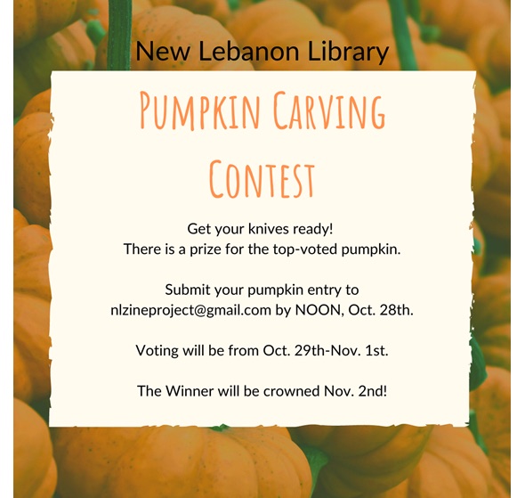 The New Lebanon Library is having a Pumpkin Carving Contest during the month of October. Carve your pumpkin then submit a picture of it before the October 28th deadline.