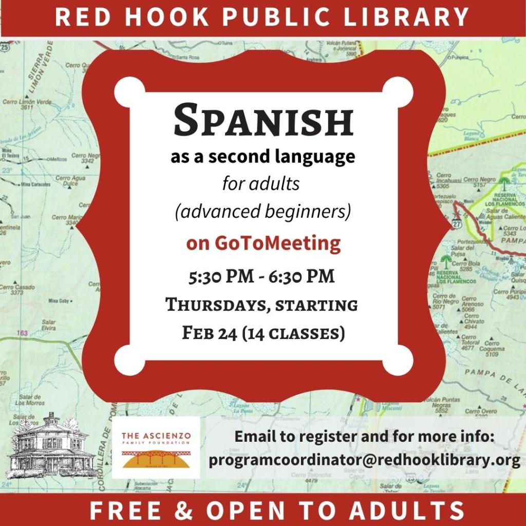 The Red Hook Public Library Spanish Language Class restarts this evening, Thursday, February 24th, and continues weekly on Thursdays for 14 weeks. The class will be held Online via GoToMeeting, with the last class on June 2 (skipping Easter Week).