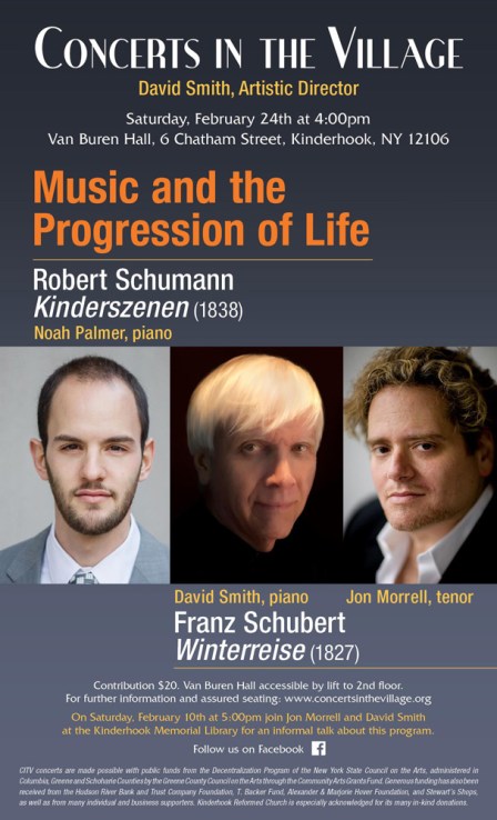 Concerts in the Village offers two memorably expressive commentaries on youth and maturity. Robert Schumann’s Kinderszenen cycle for piano (1838) presents 13 brief “imaginings,” each distilling a powerful emotion from the early years of life. Pianist Noah Palmer (CITV Musical Assistant) brings his impressive talents to these exquisite keyboard works. Following intermission tenor Jon Morrell and pianist David Smith (CITV Artistic Director) bring their own extensive experience to bear on Franz Schubert’s haunting Winterreise (1827), regarded by many as the most important and challenging song cycle ever written. In Schubert’s intense sequence of songs performers and listeners alike will experience an unforgettable “winter journey,” a remarkable passage through maturity.